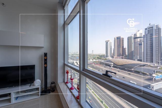 The living room is bright and spacious, with a large window overlooking Sheikh Zayed Road, offering natural light throughout the day. There’s also additional storage space thoughtfully integrated into the design.