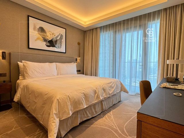 As you step into the apartment, you are greeted by a spacious and tastefully decorated living area that exudes modern sophistication. The floor-to-ceiling windows span across the length of the room, allowing natural light to flood in and providing panoramic vistas of the bustling fountain below and the mesmerizing Burj Khalifa beyond. The apartment boasts a fully equipped kitchen, complete with top-of-the-line appliances and sleek countertops.