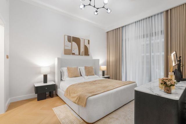 The apartment features a generous living and dining area with large windows allowing ample natural light, an open-plan kitchen with contemporary fittings, and two well-sized bedrooms with built-in wardrobes. The layout is thoughtfully designed to maximize space and functionality.