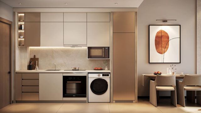 The studio is delivered fully furnished with premium-quality furniture, tasteful décor, built-in wardrobes, and a sleek open-plan kitchen fitted with modern cabinetry and refined finishes. The intelligently planned living and sleeping area creates a seamless balance between practicality and warmth, offering a welcoming atmosphere for everyday living.